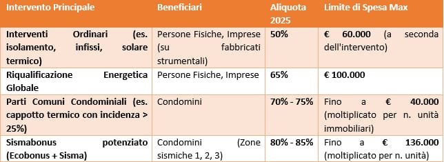Attenzione: A partire dal 2025 è prevista una rimodulazione delle aliquote per alcuni interventi e la detraibilità è stata limitata per la sostituzione di impianti di climatizzazione invernale con caldaie alimentate unicamente a combustibili fossili.
